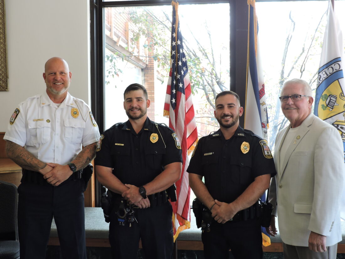 Members of the Weirton Police Department were joined by city officials, family, friends, and other guests Friday to celebrate the promotion of two of its officers. Brandon Palmeri, second from right, rose to the rank of sergeant in the department, while Nicholas Kusich, second from left, was promoted to lieutenant. Palmeri joined the department in August 2016, with certifications in fields such as drug recognition, child safety seat inspection and installation and drone operations, while also serving as a field training officer. Kusich has been with the department since November 2020, with a promotion to sergeant in June 2023. He is a member of the department’s special response team and serves as the accident reconstruction officer. Pictured with them are Police Chief Charlie Kush, at left, and Mayor Dean Harris.