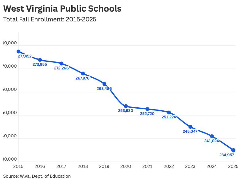 CHARLESTON — Fall enrollment numbers for West Virginia’s 55 county public school systems continued a downward trend, adding to fears of future school consolidations and closings.