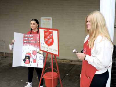 BELLS WILL BE RINGING — Alayna Bennett, left, and Eliza Hutt are among many Weir High School students who are staffing the kettles this year for the Salvation Army’s Christmas campaign. Salvation Army leaders on both sides of the Ohio River are seeking others to serve as bell ringers and aid it in other ways to help make the holiday merrier for local residents in need. -- Warren Scott
