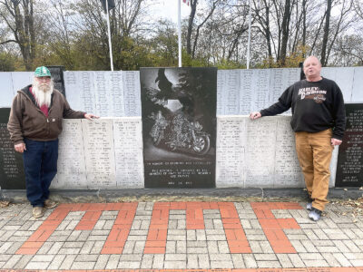- A PLACE OF MEANING — Rodney Wedlake, left, and Jay Ruttencutter are board members of the Motorcyclist Memorial Foundation. Founded in July 1993, the memorial wall holds the names of dedicated motorcyclists who have died or names of those who believe in what bikers stand for. Wedlake noted he has family members listed on the wall, including his mother and father, a brother and his in-laws. He can immediately pinpoint the location of their names on the opposite side of where he stands. The wall is especially meaningful to him, as he ensures its upkeep by visiting the site at least three times a week. — Julie Stenger