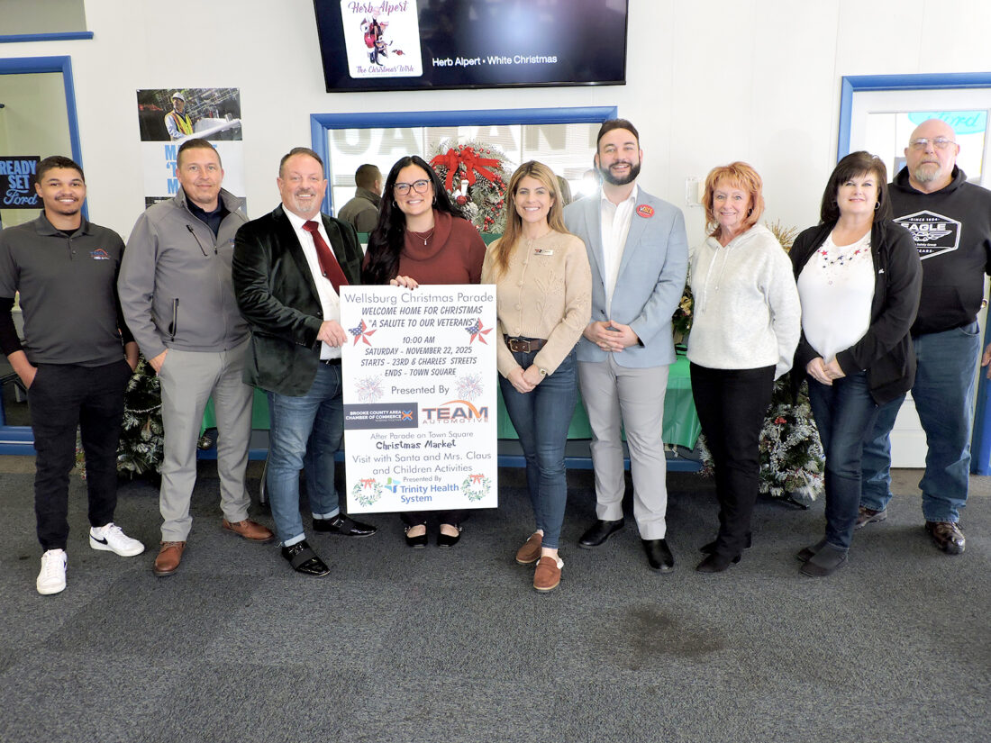 HOLIDAY SEASON APPROACHING — The Brooke County Area Chamber of Commerce, TEAM Ford Wellsburg and Trinity Health System have teamed to hold this year’ s Wellsburg Christmas Parade and Christmas Market, a day of holiday festivities that will begin at 10 a.m. Nov. 22. On hand for the announcement were, from left, Daniel Kidder and Charlie Rubel of TEAM Ford Wellsburg; Chamber President Eric Fithyan; Paige Hashman of TEAM Ford Wellsburg; Jessica Elias of 7 Ranges Entertainment; Realtor Tony Viola; Sandy Kemp and LuAnn Radcliffe of the Brooke County Senior Center; and City Manager Steve Maguschak. -- Warren Scott