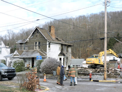 Members of the New Cumberland Volunteer Fire Department, and other residents, watch Tuesday afternoon as crews clear debris from the scene of a multiple-structure fire at the intersection of Second Avenue and Lincoln Street in New Cumberland. Three houses were reported destroyed by the blaze, which began late Monday, with other nearby structures experiencing heat and smoke damage. An investigation is continuing into the fire, which saw response from departments throughout Hancock and Brooke counties, as well as Jefferson County and Columbiana County in Ohio, and several areas of Pennsylvania. — Craig Howell