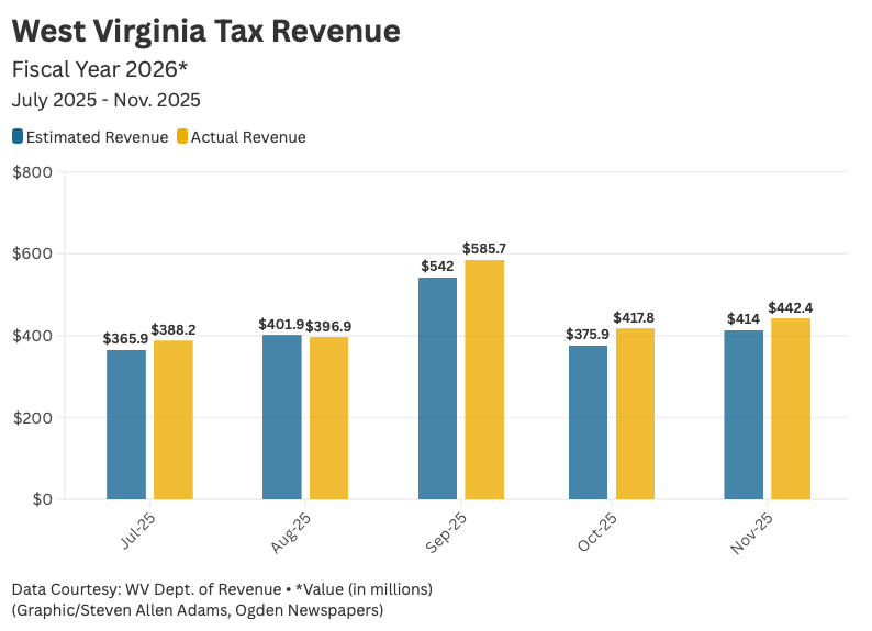 The state Department of Revenue and the Senate Finance Committee both released reports Monday detailing tax collections for November and the first five months of fiscal year 2026 for West Virginia’s general revenue fund.