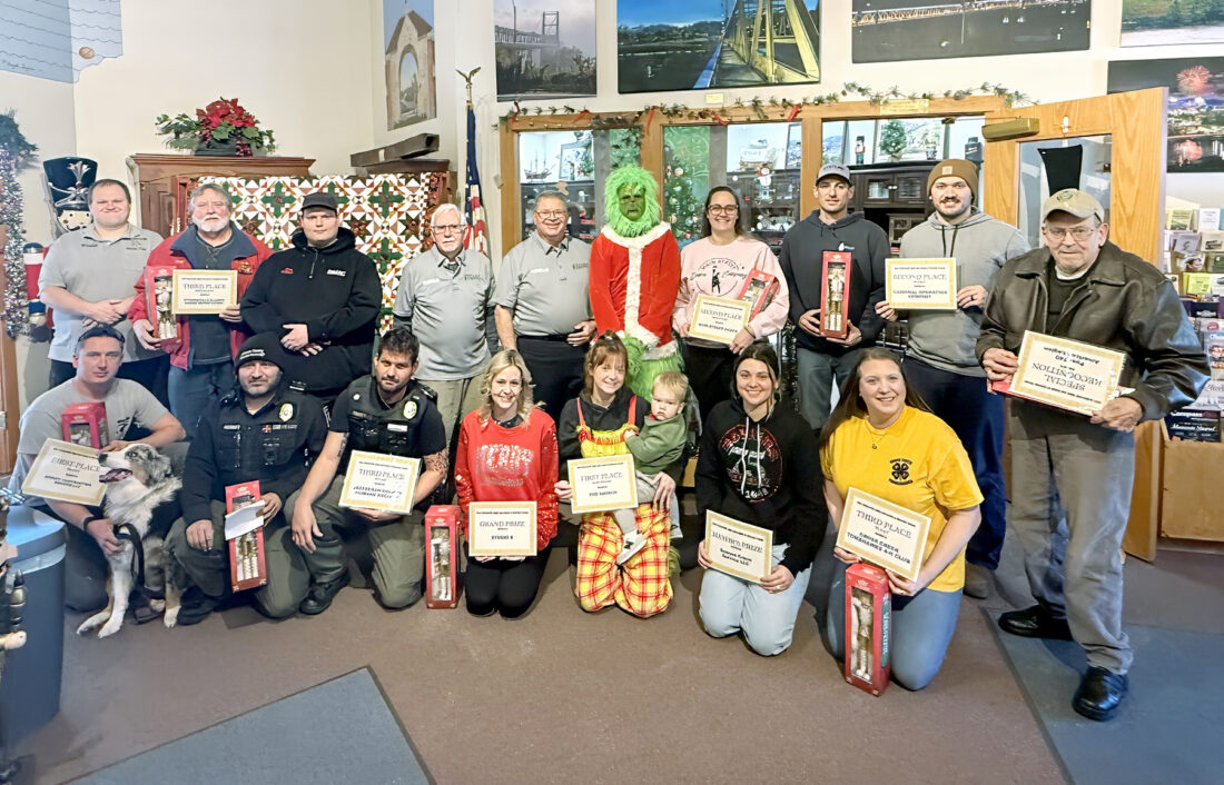 Winning entries for the 2025 Steubenville Sights and Sounds of Christmas Parade, which was held Dec. 6, received their keepsake nutcrackers and certificates Wednesday during an event at the Visitors Center at Historic Fort Steuben. Claiming honors in the floats category were Eastern Construction and Excavating and Speedy Contracting Service, tied for first; Cardinal Operating Co., second; and Cross Creek Tomahawks 4-H and Jefferson County Humane Society, tied for third. Non-float honorees were the Grinch, first place; Main Street Dance, second; and Steubenville Aladdin Shrine Motor Patrol, third. Taking home the Grand Prize was Studio B. Bowers Crane Services LLC won the Mayor’s Award, and American Legion Post 740 took special recognition; Special acknowledgement was given to Steubenville Weirton Amateur Radio Club in recognition for the club’s “years of service in assisting” parade organizers, providing communications as well as assisting with the parade lineup. Gathering in the Steubenville Visitors Center for the awards ceremony were, from left, front: Speedy Contracting’s James Speedy with Tito; the Humane Society’s Charles Merritt and Nick Thayer; Studio B’s Randi Herceg; the Grinch’s Bailie Murphy (as Cindy Lou Who) with her son, Weston Grobelny; Bowers Crane’s McKenzie Bowers; the American Legion’s William Burruss; and back, Vince Ossi and Larry Sneathen of the Shriners; Steubenville-Weirton Amateur Radios Chris Moodie, Paul Brandt and Rick Shuster; the Grinch’s Michael Dolak; Main Street Dance’s Allison Pizzoferrato; and Cardinal’s Ryan Busby and Zack Bonds. — Linda Harris