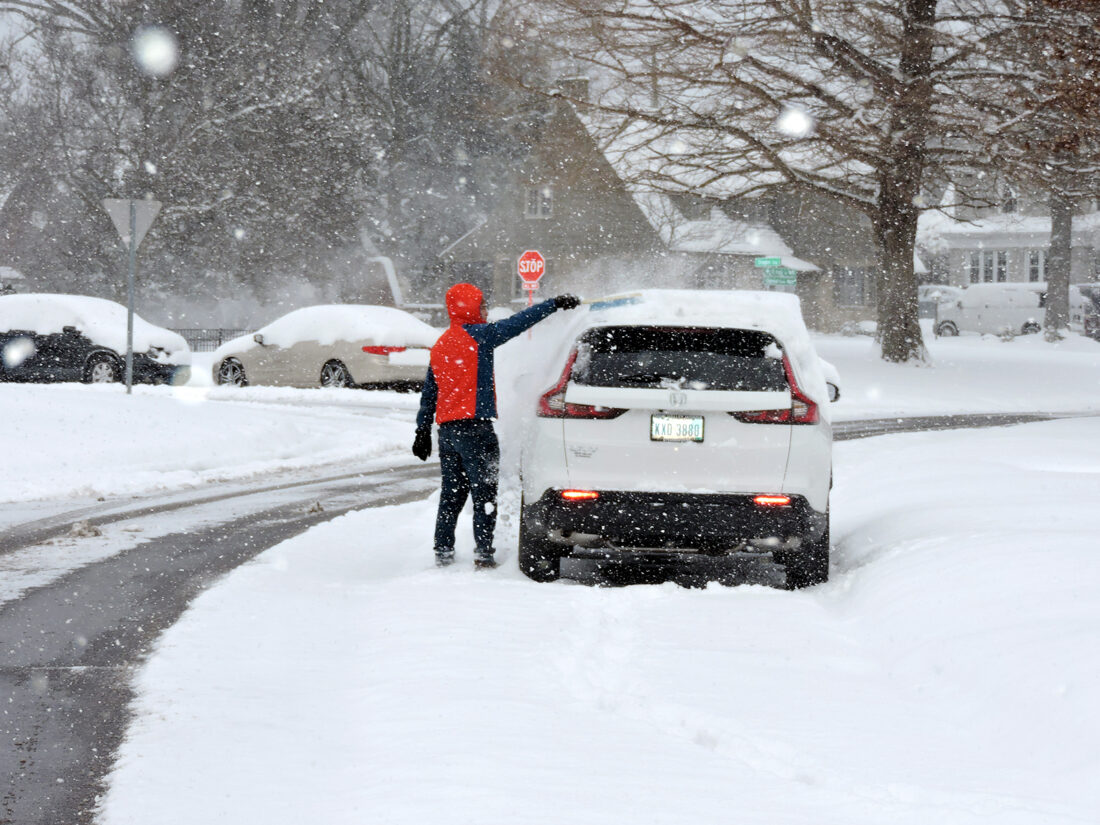 HEAVIER THAN EXPECTED — Clearing snow from his car on Granard Parkway while still more fell, Mario Huzovic of Steubenville was among many Tri-State Area residents who awoke Tuesday morning to find more of it on their vehicles and roadways than expected. The heavier spate of precipitation didn’t occur throughout all of the Ohio Valley, however, and may have been spurred by an isolated weather pattern originating from Lake Michigan. -- Warren Scott
