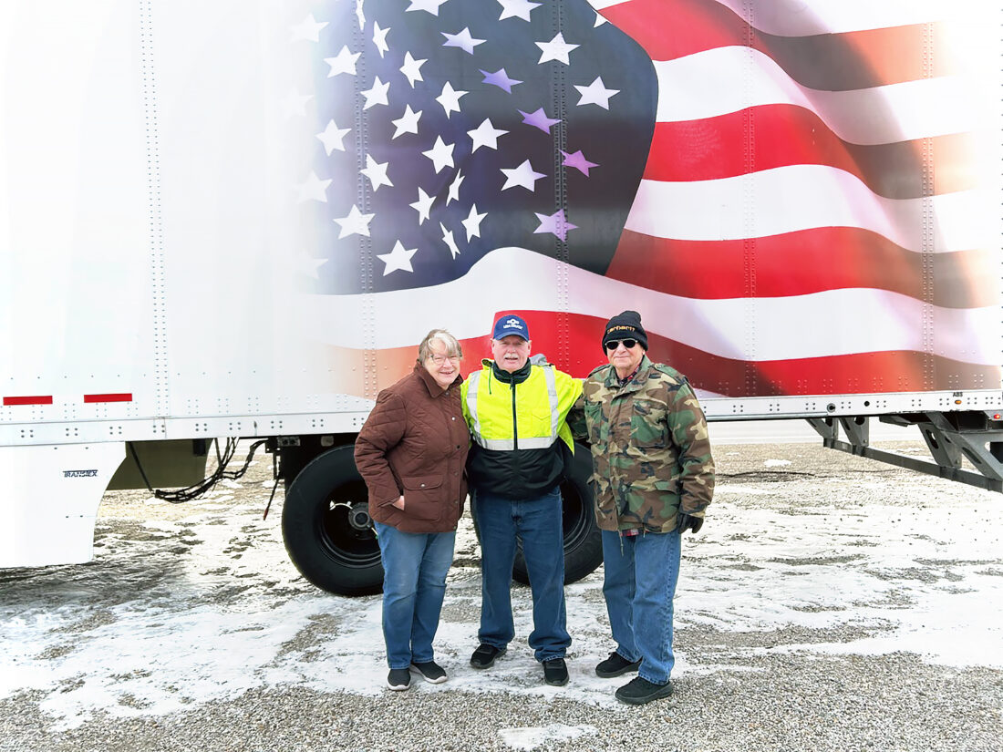 ORGANIZING A MEANINGFUL EVENT — Jeff Hicks, center, a truck driver who transports wreaths across the United States for the annual Wreaths Across America event, assisted area residents Suzanne and Jim Smarrella in unloading and moving 21 boxes of wreaths on Dec. 13. The Smarrellas continue to take part in this special tribute to those service members who have died. -- Contributed