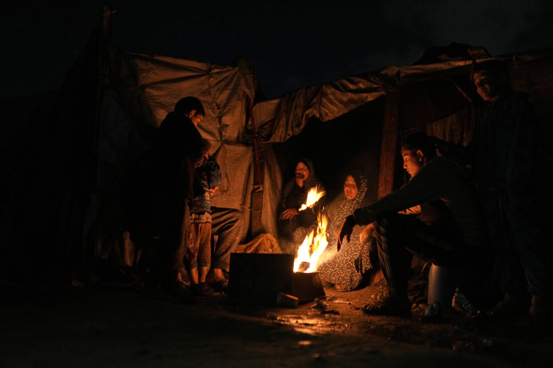 Displaced Palestinians warm themselves around a fire at a tent camp in Gaza City, Sunday, Jan. 18, 2026. (AP Photo/Jehad Alshrafi)