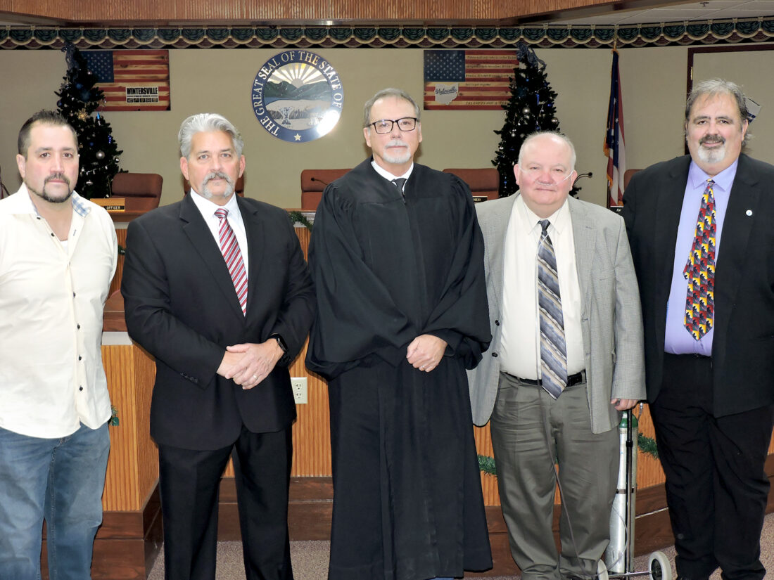 Wintersville county court Judge Michael Bednar Wednesday administered oaths of office to four Wintersville councilmen who were re-elected in the Nov. 4 general election. On hand for the occasion were, from left, Councilmen Carmen DeStefano and Randy Spence; Bednar; and Councilmen Bob Merriman and Jason Mattern. — Warren Scott