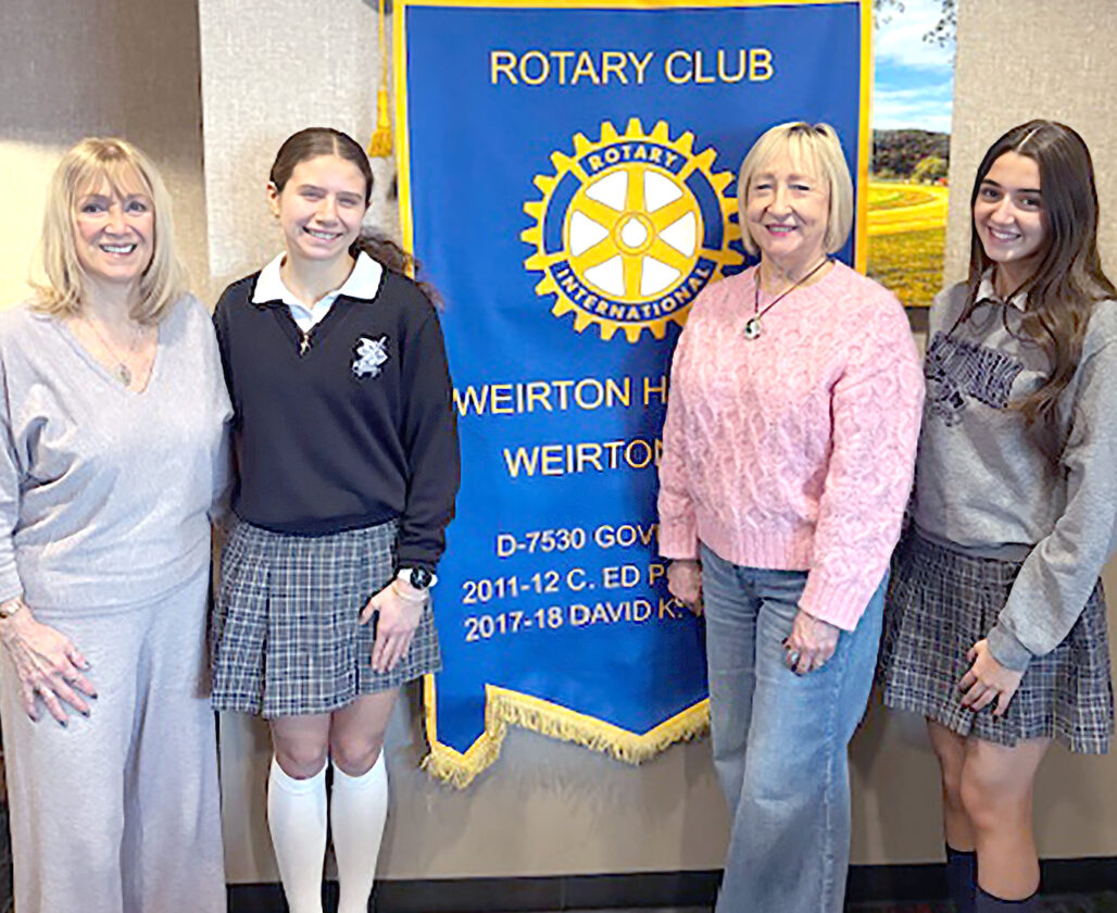 During its Jan. 13 meeting, members of the Rotary Club of Weirton Heights heard from Madonna High School juniors Lucia DiBacco and Sophia Soly, who spoke about their experiences attending the Hugh O’Brian Youth Leadership Seminar, held last June at Fairmont State University. They participated in workshops designed to strengthen their leadership and public speaking skills, while interacting with other students from around the state. Their participation was sponsored by the Rotary Club of Weirton Heights. Pictured, from left, are Rotarian Brenda Mull, Soly, club President Cathie Caranda, and DiBacco. — Contributed