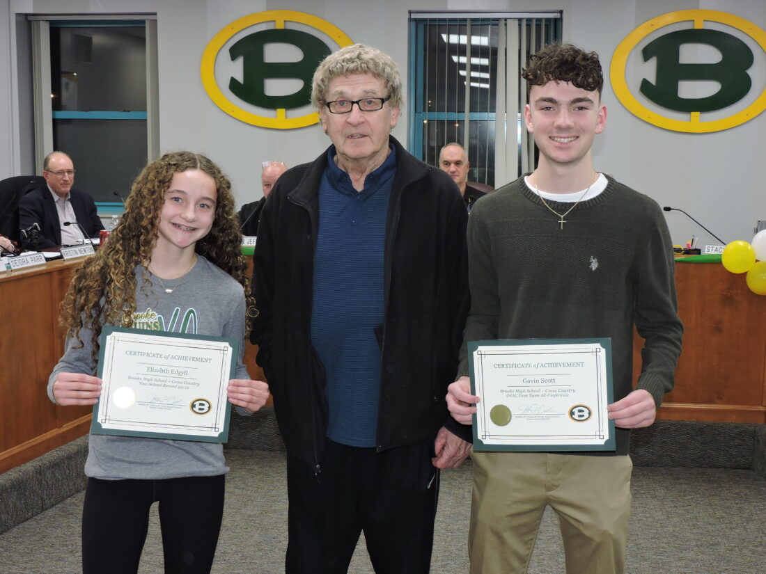 TOP RUNNERS — The Brooke County Board of Education recognized Brooke High School cross country athletes Gavin Scott for being named OVAC First Team All Conference; and Elizabeth Edgyll for setting a new school record of 20 minutes, 12 seconds while running 3.1 miles. With them is their coach, Ed Fritz. -- Warren Scott
