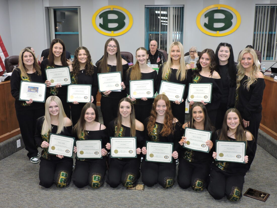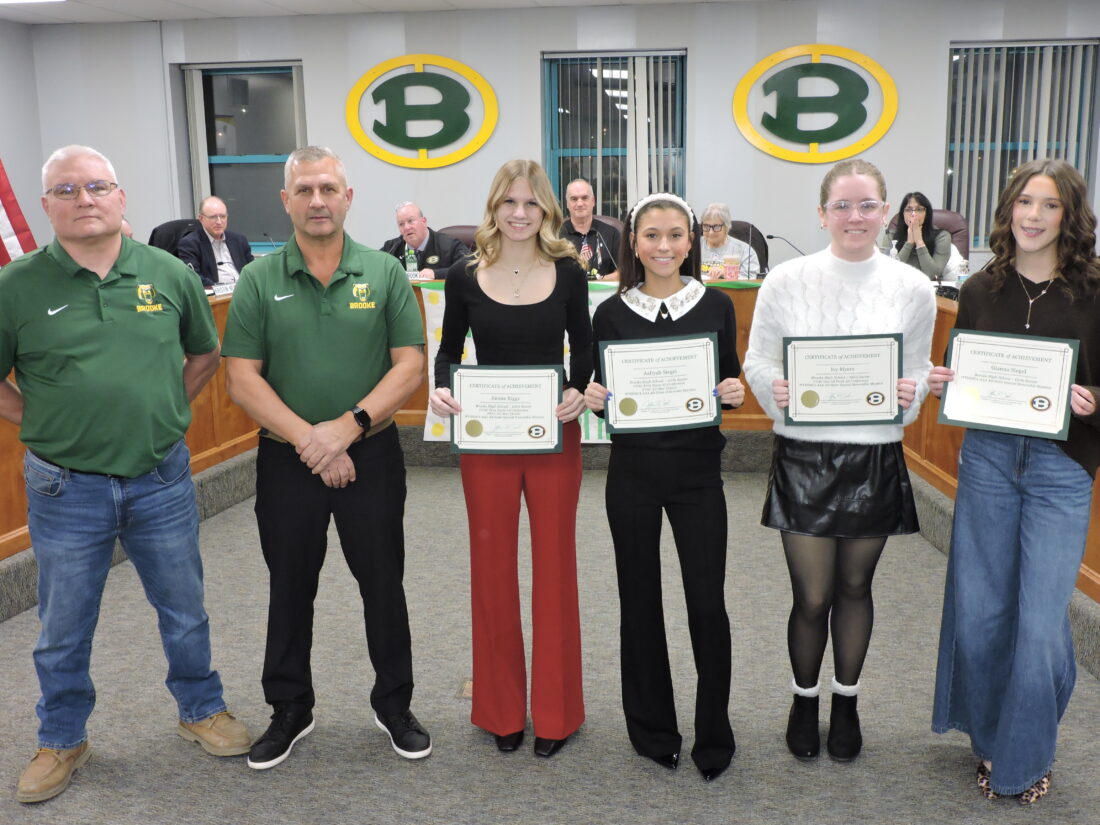 WELLSBURG — The Brooke High School Cheerleaders’ victory at the state cheering competition was among many accomplishments by Brooke County students that were recognized by the local school board on Monday.
