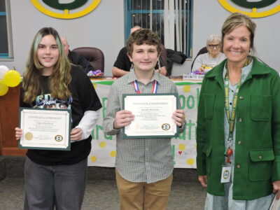 LITERARY HONORS — Also recognized at Monday’s Brooke County school board meeting were winners of the West Virginia Reading Association’s Literature Fair. From left are Tegyn Danielson, Swade Walnoah and Lori McLaughlin, director of elementary and pre-kindergarten education. Elizabeth Queen and Myles Hotlosz also were winners of the competition. -- Warren Scott