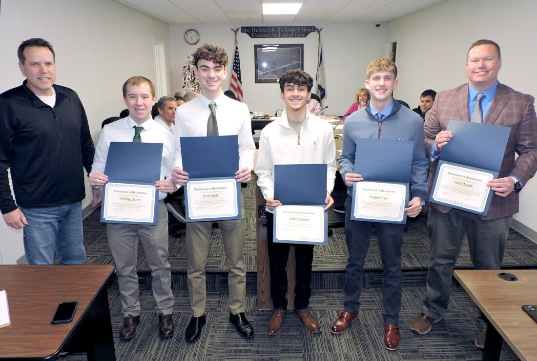 Follansbee Council and Mayor Scott McMahon recognized members of the Brooke High School chapter of the Future Business Leaders of America Monday for winning the Robin Hayhurst School Pitch Competition. Working in two teams, the five students pitched ideas for inventions and won $2,500 for each team to develop them and $25,000 for Bruins Helping Bruins, the school’s food pantry. From left are McMahon; students William Harvey, Gavin Scott, Andrew Petrella and Cooper Byers; and Chad Haught, the club’s adviser. Kai Bowers was on one of the teams that won the contest. — Warren Scott