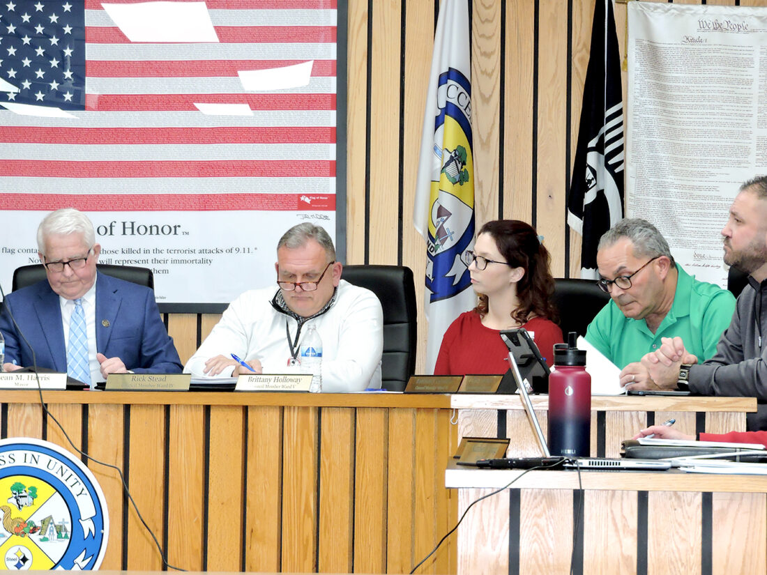 HOLDING OFF — Weirton Council, during its meeting Monday night, tabled a proposal which would have seen the city hire six new firefighters to assist in the reopening of the County Road Fire Station. Pictured, from left, are Mayor Dean Harris, Ward 4 Councilman Rick Stead, Ward 5 Councilwoman Brittany Holloway, Ward 6 Councilman Anthony Rocchio, and Ward 7 Councilman Chris Jonczak. -- Craig Howell