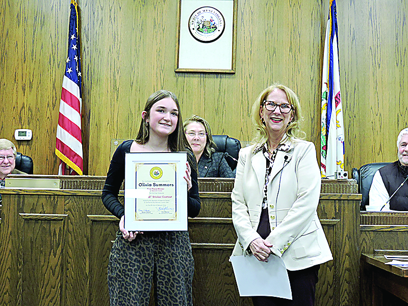 Hancock County officials took time, Thursday, to recognize Olivia Summers, an eighth-grade student at Weir Middle School, who was named the county winner of West Virginia’s “I Voted” sticker design contest, organized by the West Virginia Secretary of State’s Office. Summers’ design includes a red and blue ribbon, with a background including mountains, a bridge and river. According to Hancock County Clerk Karan Valenti, the design will be used for stickers given to voters in the county as part of this year’s election.