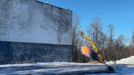 At Diserio’s direction, a cannon built some years ago by his father and Jeremy Cercone, an employee there, was used to fire a symbolic shot at the screen, disbursing a short burst of fire and smoke.