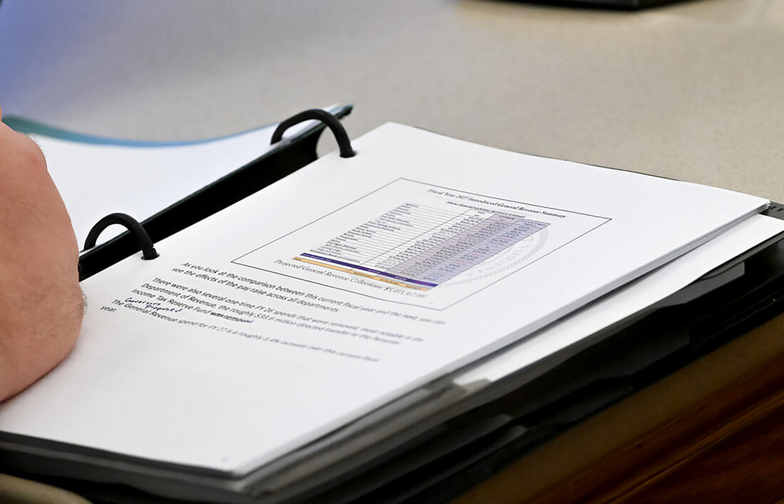 BUDGET DISCUSSED – A member of the Senate Finance Committee flips through a presentation Monday on Senate Bill 250, the Senate’s version of Gov. Patrick Morrisey’s general revenue budget proposal for fiscal year 2027. -- Photo Courtesy/WV Legislative Photography