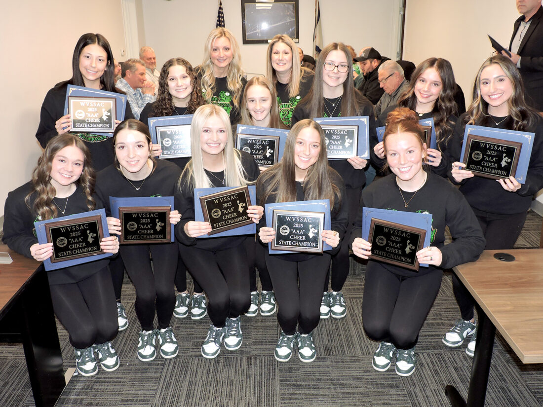The Brooke High School Cheerleaders were special guests at Monday’s Follansbee Council meeting, where they were recognized for winning the West Virginia Secondary Schools Activities Commission’s state cheering competition for the second consecutive year. The squad includes, Cadance DeVore, Gabriella Hornick, Sophia Sacripanti, Gianna Svokas, Kayla Easton, Karlee Hornick, Paisley Sadler, Lyla Van Horn, Marlee Ewusiak, Braya Mazeika, Addison Scherich, Ava Gatten, Raelin Stoll, Ava Scherich and coaches Michelle Scherich, Trishann Sacripanti and Haley Bowman. — Warren Scott