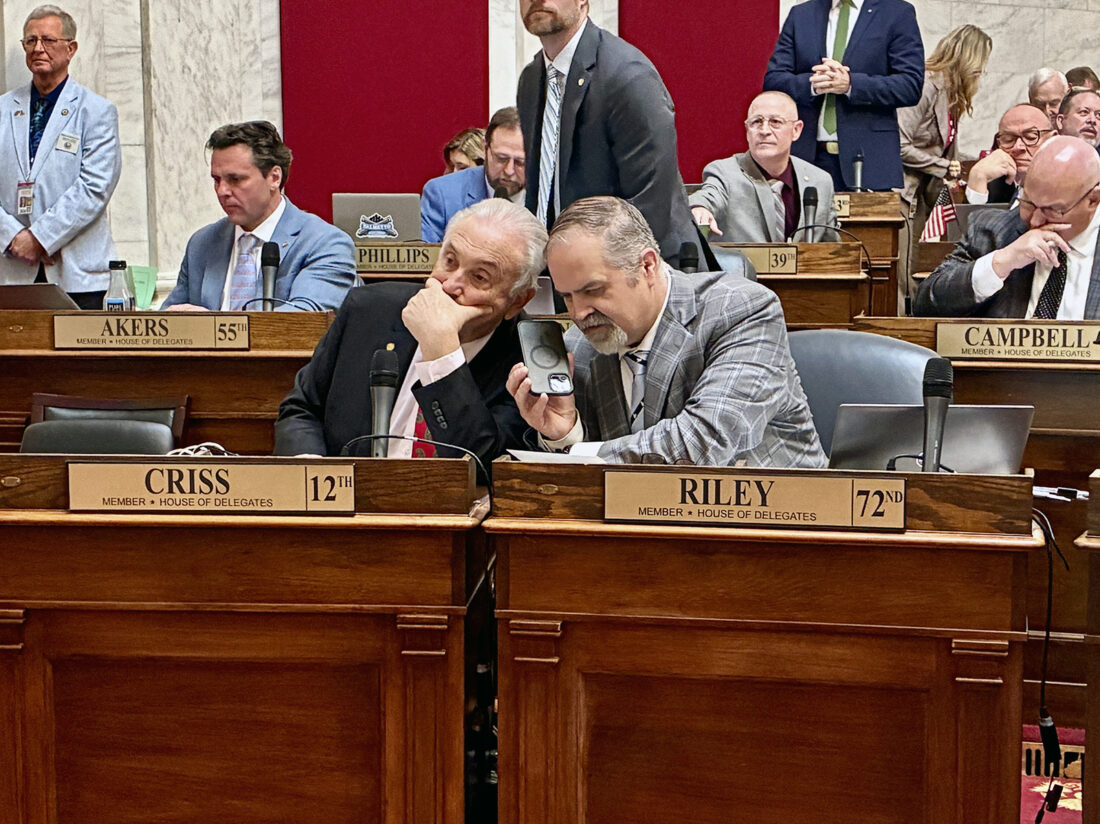 House of Delegates Finance Committee Chairman Vernon Criss, left, and Vice Chairman Clay Riley listen to a livestream of the state Senate’s floor session through a phone on the House floor Thursday as the Senate amended and passed a compromise version of Senate Bill 250, the budget bill. -- Steven Allen Adams