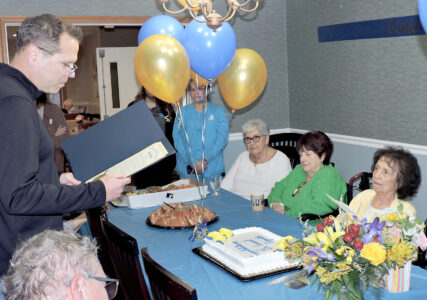 RECEIVING HONOR — Follansbee Mayor Scott McMahon reads a Certificate of Recognition from West Virginia Gov. Patrick Morrisey, presented in honor of Carmel Esposito during a ceremony Wednesday morning at Wyngate Senior Living Community in Weirton. -- Craig Howell