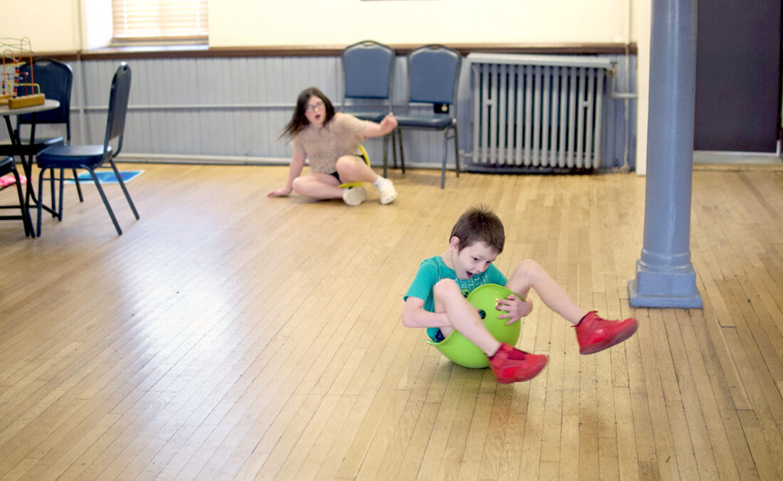 A FUN TIME — Leonardo Huff spins on a sensory-friendly toy at Easterseals Rehabilitation Center’s Sensory-friendly matinee at Oglebay Institute’s Towngate Theatre and Cinema, as Marley Sandreth spins behind him. -- Gage Vota