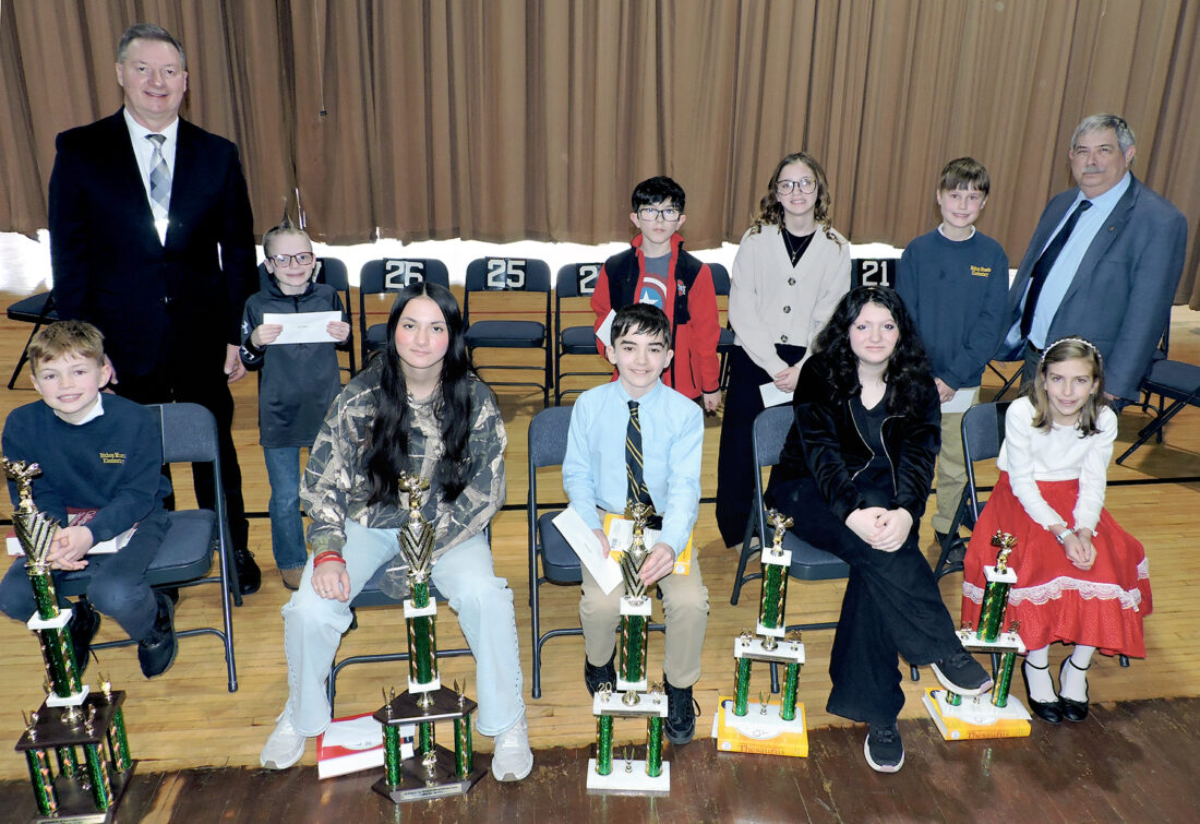 TOP SPELLERS — Francis Kissinger, a fifth-grader at Bishop John King Mussio Elementary School, emerged the winner of the 2026 Jefferson-Harrison County Regional Spelling Bee Saturday at Buckeye North Elementary School. Kissinger will compete in the Scripps National Spelling Bee in Washington, D.C., in May. On hand for the presentation of trophies and prizes to the bee’s top 10 finishers, were, from left, front: Kissinger, Brheanna Boyles, a seventh-grader at Buckeye Local Junior High School, who placed second; Samuel Romanowsky, a seventh-grader at Catholic Central High School, third place; Crystal Albright, a seventh-grader at Harrison Central Junior-Senior High School; and Julia Greenly, a fifth-grader with the Heart of Mary Homeschool network; and back, Ron Sismondo, director of curriculum and professional development at the Jefferson County Educational Service Center and the bee’s coordinator; Bentley Miller, a fifth-grader at John Gregg Elementary School; Ben Gorby, a fifth-grader at Indian Creek Middle School; Caraline Cooper, a fifth-grader at Toronto Elementary School; and Jerome Owen, a fifth-grader at Bishop John King Mussio Elementary School; and Ross Gallabrese, senior writer for the Herald-Star, which presented the bee. Lucas Wood, a seventh-grader at Harrison Central Junior-Senior High School, placed 10th. -- Warren Scott
