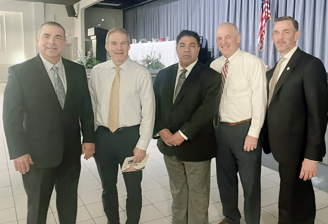 LINCOLN DAY DINNER — The Jefferson County Republican Party held its annual Lincoln Day Dinner Thursday at the St. Florian Event Center. The event included, from left, Brian Scarpone, chairman of the GOP Central Committee and Jefferson County treasurer; U.S. Rep. Jim Jordan, R-Urbana; Nate Freeman, county GOP chair; state House Speaker Matt Huffman, R-Lima; and U.S. Rep. Michael Rulli, R-Salem. -- Ross Gallabrese