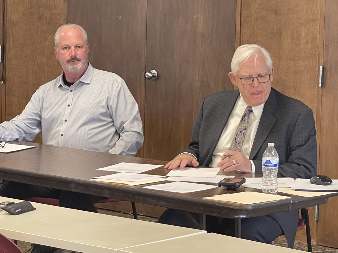 Ross Gallabrese DISCUSSION — Mike Gill, board chairman of the Jefferson County Port Authority, left, and Robert Naylor, the executive director, look on during Thursday's meeting.