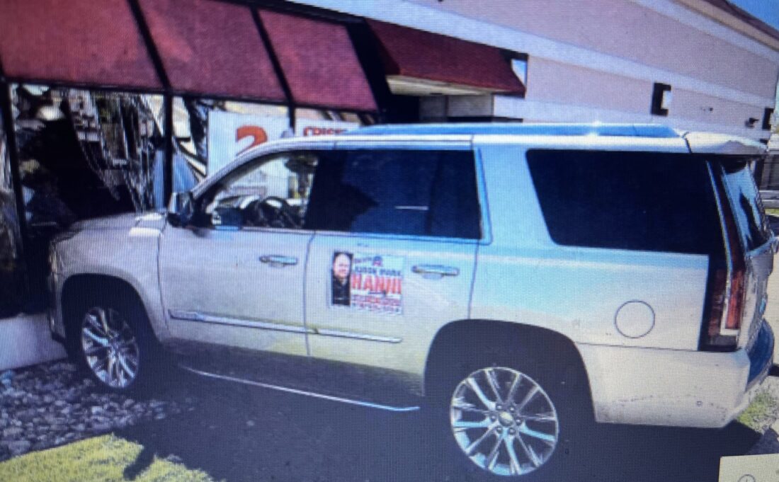 Hanni and Miller told police that they were sitting in the restaurant’s parking lot eating lunch with the vehicle, with a Hanni campaign sign on it, not in park. The vehicle began to roll forward and Hanni accidentally pressed the gas pedal rather than the brake, causing the Escalade to jolt forward and into the building, according to the police report.