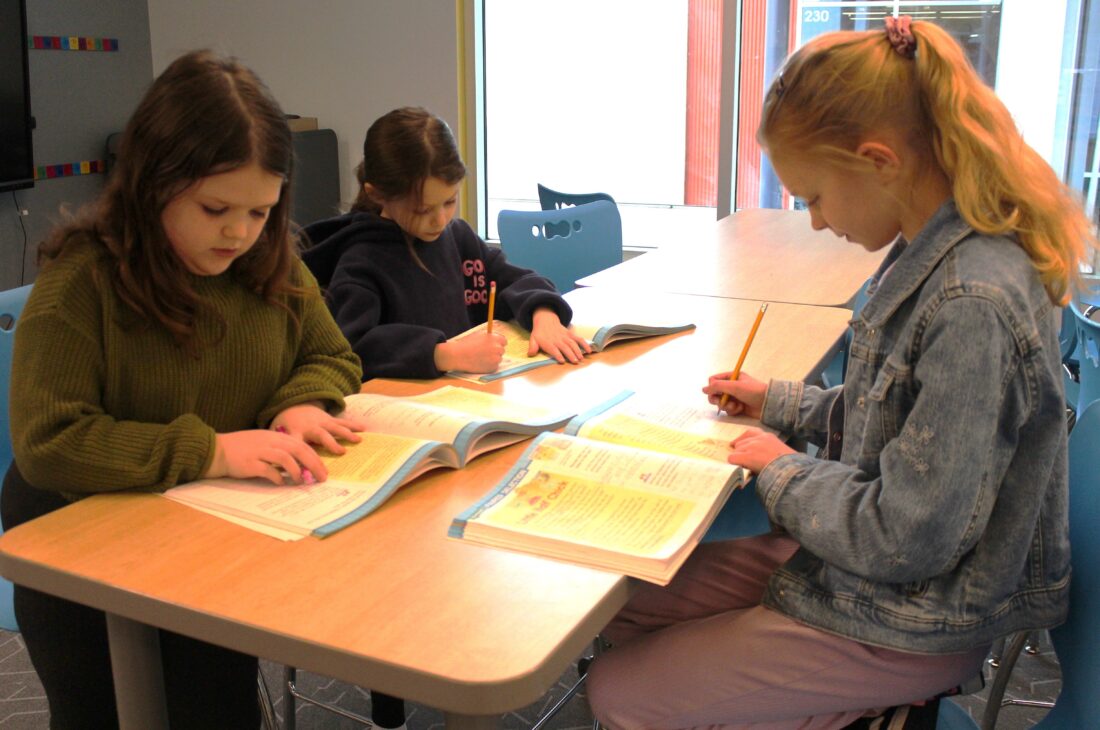 Photo provided Cross Creek Elementary has seen a boost in school attendance and attributes it to the school’s involvement with the Leader in Me initiative. LIM, as it is known, integrates leadership, culture, and success and helps improve student learning because they want to come to school. Pictured are, from left, third graders Aria Kachur, Abby Miller, and Annie Ramsey honing their skills in a school pod.