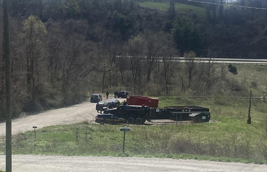 Photo by Derek Redd Law enforcement waits on a road outside woods where a double amputee fled police in Belmont County on Saturday.