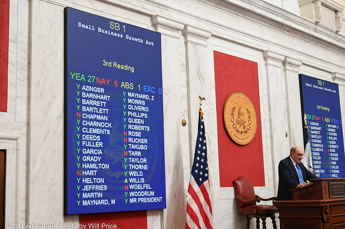WV FLOOR –Senate President Randy Smith presides over the Senate floor session on Feb. 6 as Senate Bill 1, his bill creating the West Virginia First Small Business Growth Act, passes the Senate in a 27-6 vote.