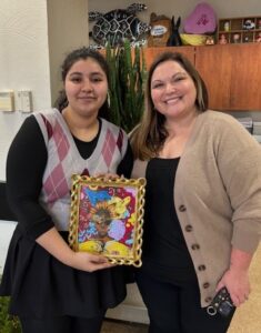 Photo provided Steubenville High School senior Vítória Rabelo Da Silva Yendo, left, is pictured with Kurtz Bros. representative Renee Stover and an original artwork which will be included within the pages of the company’s 2026-2027 catalog. The Pennsylvania-based business held its first-ever cover design contest and received nearly 70 submissions while Rabelo Da Silva Yendo earned a place in the competition, receiving a pizza party for the school art club plus a $250 gift certificate to supply the classroom.