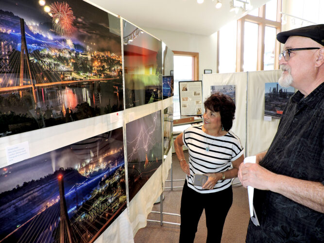 Dennis Jones of Weirton and Gina Judy of Richmond discuss one of many landscapes he has photographed during the opening reception Wednesday for an ongoing exhibit at the Historic Fort Steuben Visitor Center. With Garen DiBartolomeo, Jones and Judy are co-curators of the show, which features ...