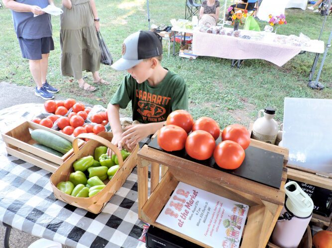 Grady Farris, 7, of Wellsburg assisted his family, owners of Family Roots Farm, with their produce stand at the Brooke County Farmers Market last week. Wednesday’s farmers market will have a fair theme, with food trucks, a petting zoo, kids pedal tractor pull, cotton candy and other special ...