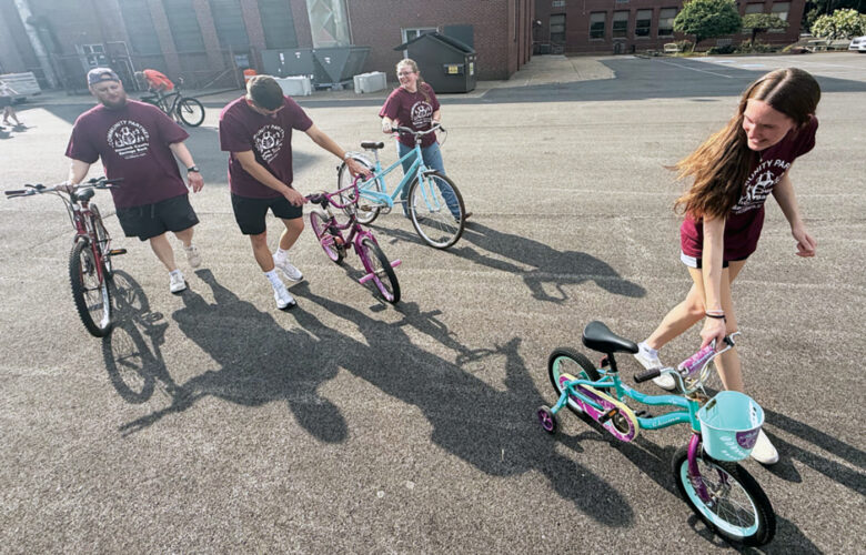 Hancock County Savings Bank partnered with Communicycle and the East Liverpool City Health District to provide free bicycles and helmets to area residents during a distribution event hosted by the City of Chester. Pictured, from left, are Philip Poling, Ethan Arner, Ellen Hartley and Mallory ...