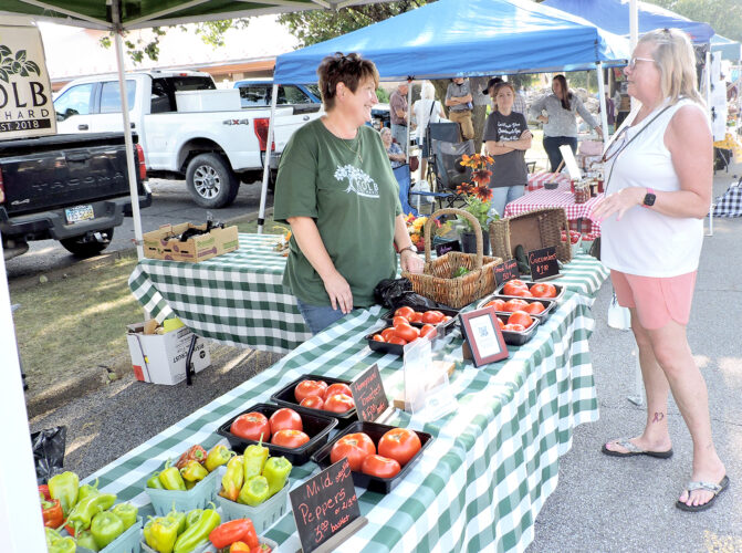Mary Sadowski of Kolb Orchard of Hammondsville chats with Tammy Hammer of Wintersville at the Farmers Gateway Market. Held from 4:30 p.m. to 6:30 p.m. each Wednesday through October in the front lot of Blessed Sacrament Catholic Church, the weekly market offers an assortment of locally grown ...