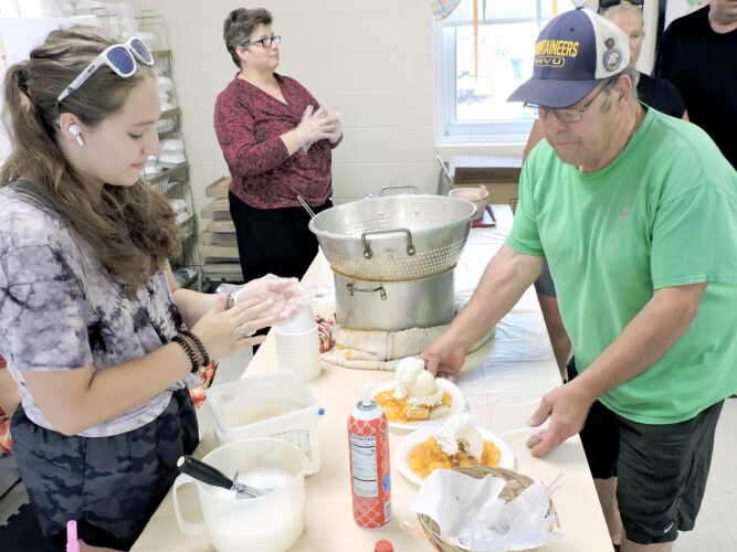 Maria Sikora, left, served up a peach shortcake for George Gurrera of Weirton, one of many who turned out Saturday for St. Thomas Episcopal Church’s Peach Festival, a fundraiser the church has held for more than 50 years. A local Girl Scout, Sikora was among many volunteers who assisted the ...