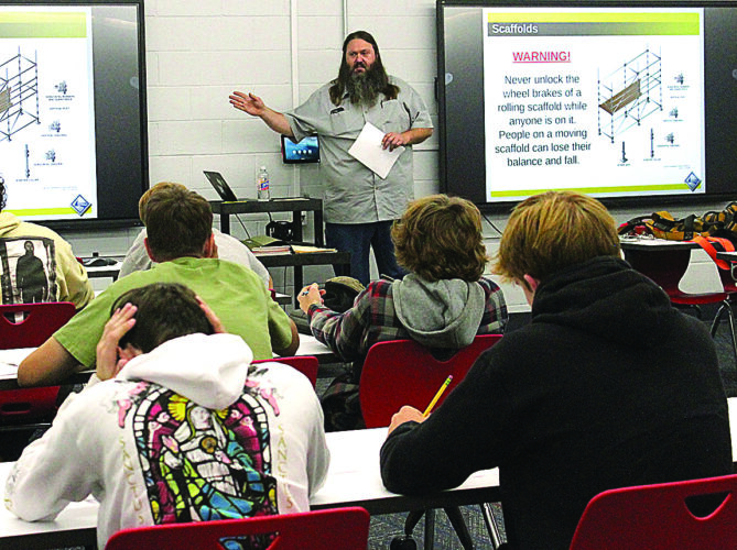 Buddy Davis, electrical trades program instructor at the Jefferson County Joint Vocational School, offers a lesson as part of Occupational Safety and Health Administration certification training. Included is information about fall prevention, ladder safety and aerial lift, forklift and scissor ...