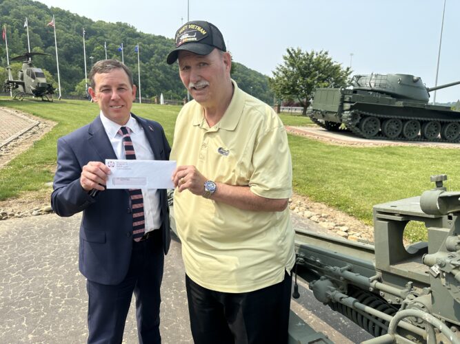 Doug Comm, president/CEO of Hancock County Savings Bank, presented George Ash, representing the Weirton Veterans of Foreign Wars Post No. 2716, with a $1,000 donation to help with the upkeep and beautification of the Brooke-Hancock County Veterans War Memorial Park. Located at the west end of ...
