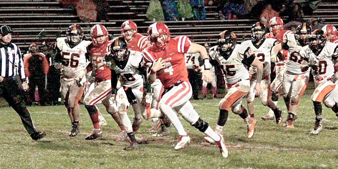 Toronto’s Nate Karaffa rushes past multiple Wellsville defenders on Friday. (Photo by Andrew Grimm)