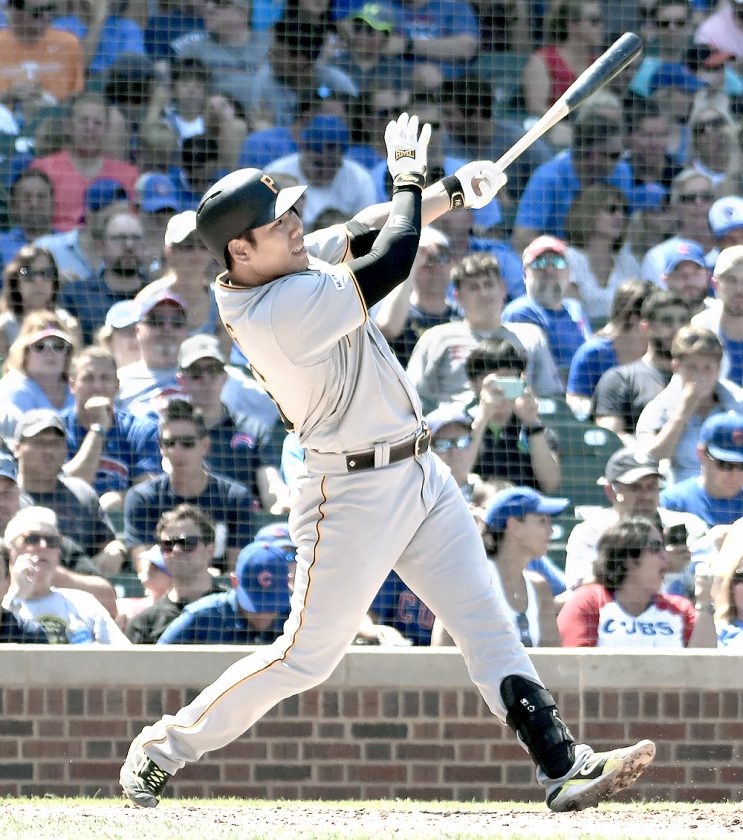 Pittsburgh Pirates' Jung Ho Kang (16) hits a home run against the Chicago Cubs during the fifth inning of a baseball game, Saturday, July, 13, 2019, in Chicago. (AP Photo/David Banks)