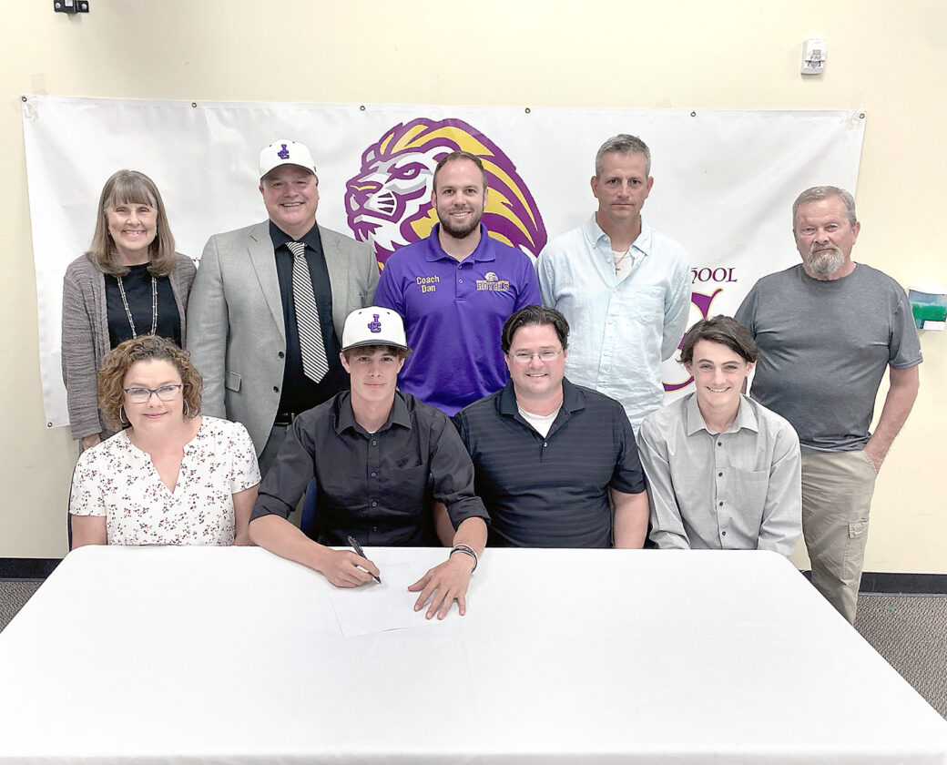 Jefferson County Christian School senior Mason Gump signed to continue his academic and athletic careers at Geneva College. Gump was a four-year starter at shortstop and pitcher for the Jefferson County Christian School’s baseball team, holding several school marks while helping the Royals win three SWCAC tournament titles. With Mason, front, second from left, for the occasion were, front, from left, Shannon, Nate and Lee Gump; back, from left, Shari Ware, JCC baseball coach Shawn Hervey, JCC athletic director Dan Sells, assistant coach Scott Adams and Rod Ware. – Contributed
