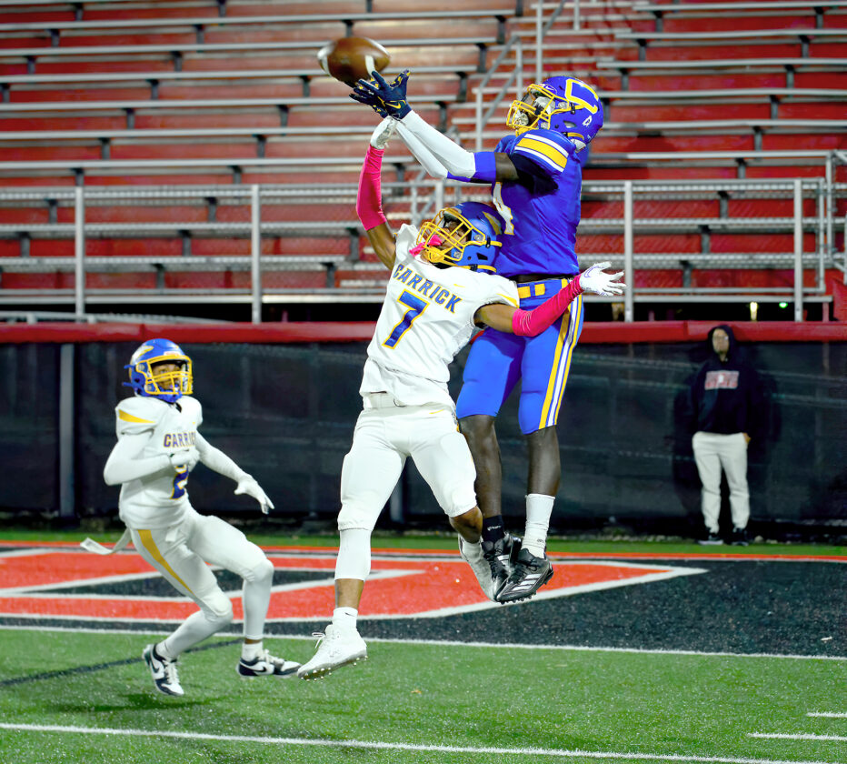 OVER THE TOP — Catholic Central's Rahim Mitchell goes up and over Carrick defender Mike Davis to make a catch near the goal line during Saturday's senior night game at Harding Stadium. Mitchell made the catch and the Crusaders went on to win, 26-18, to finish the regular season 7-3.