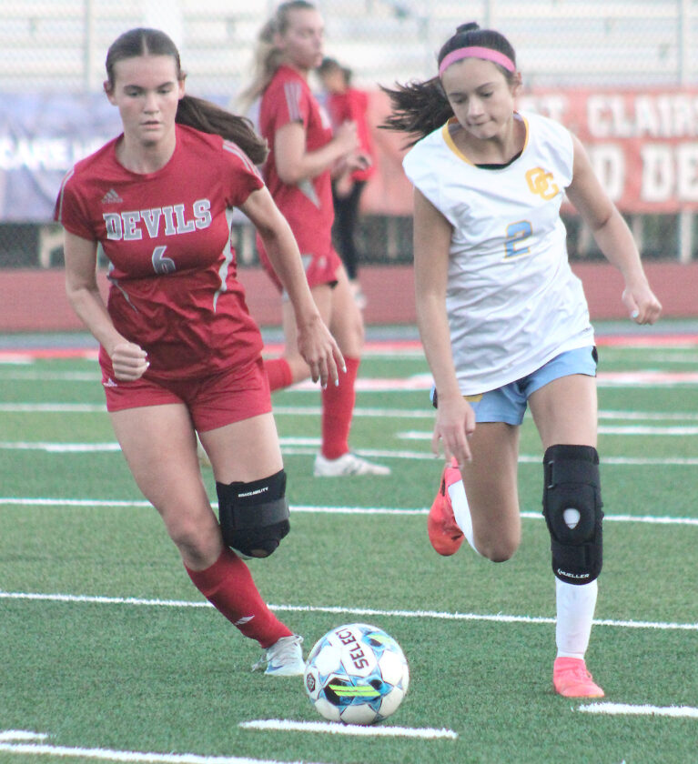 IN PURSUIT — Oak Glen’s Addyson Wells and St. Clairsville’s Kaylee Shafer give chase to get possession of the ball. - Kailin Hughes