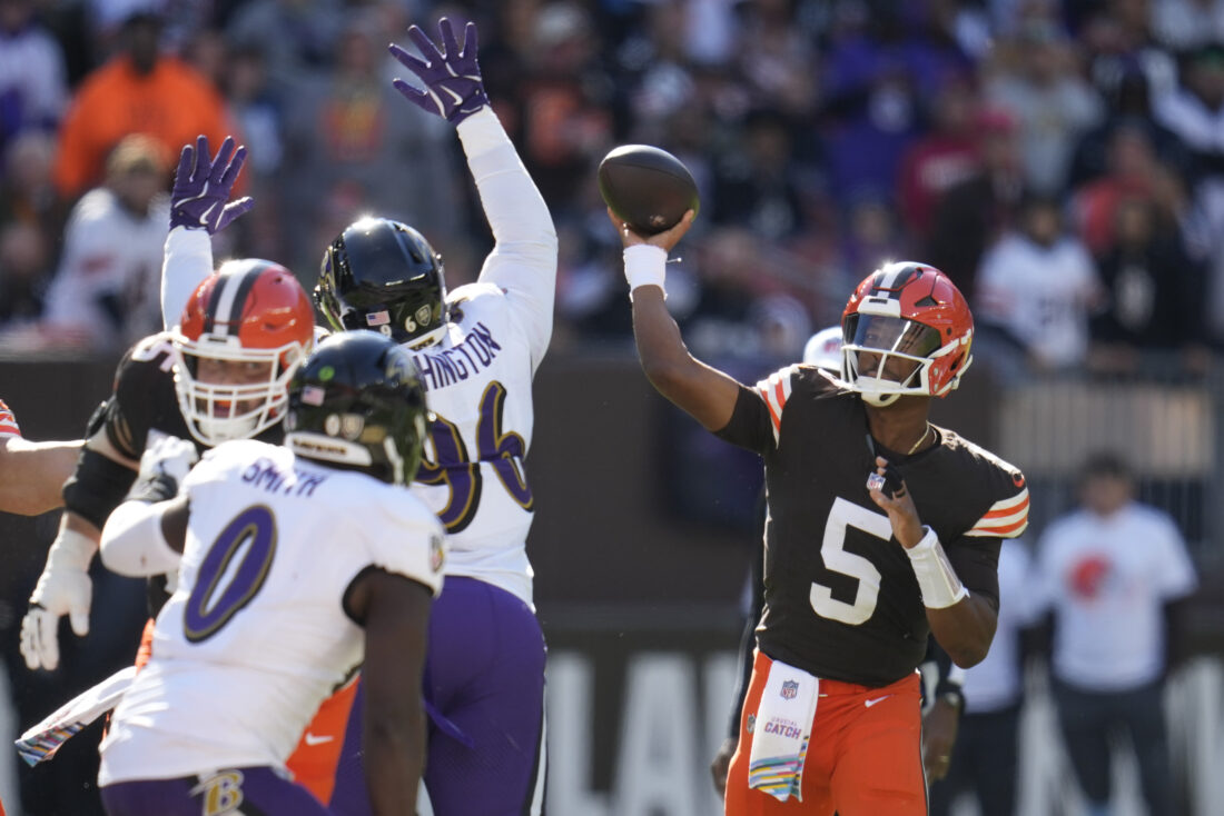 Cleveland Browns quarterback Jameis Winston (5) throws over Baltimore Ravens defensive tackle Broderick Washington (96) during the first half of an NFL football game in Cleveland, Sunday, Oct. 27, 2024. (AP Photo/Sue Ogrocki)