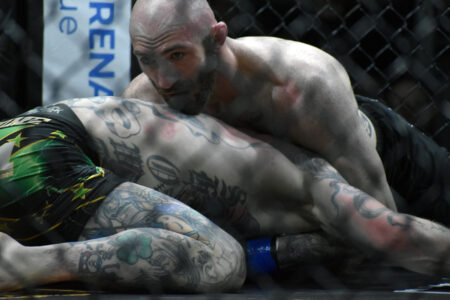 - Steubenville’s Niko Petrides looks for a choke against Brett Shoenfelt of Holidaysburg, Pa. during a professional 170-pound bout at the 247 Fighting Championships Brawl in the Burgh 28 Saturday night at the CFSBank Event Center in Belle Vernon, Pa. Petrides won by TKO. – Stephanie Elverd