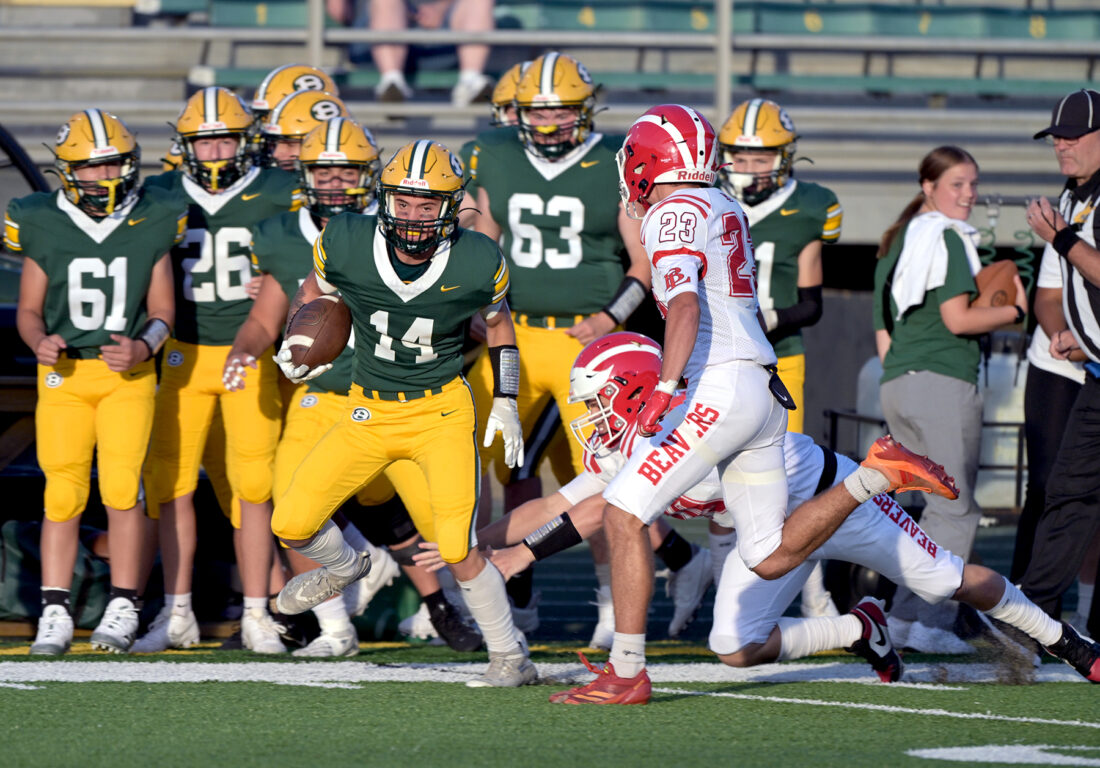 Brooke’s Ethan Fisher tries to elude Beaver Local defenders during Friday night’s season opener at Brooke Memorial Stadium. The Beavers defeated the Bruins, 26-0. Brooke is back at home next week to host Linsly. – Michael D. McElwain