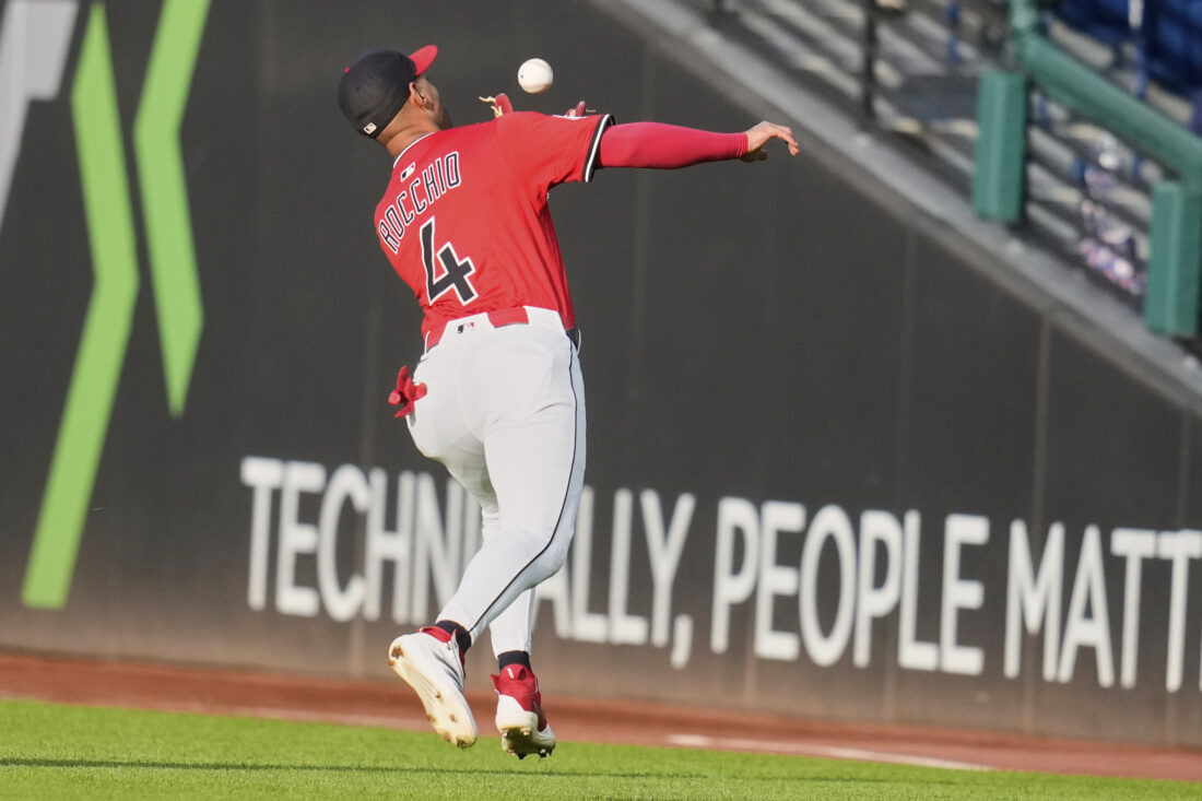Cleveland Guardians second baseman Brayan Rocchio (4) catches a fly ball hit for an out by Tampa Bay Rays' Junior Caminero in the first inning of a baseball game in Cleveland, Monday, Aug. 25, 2025. (AP Photo/Sue Ogrocki)