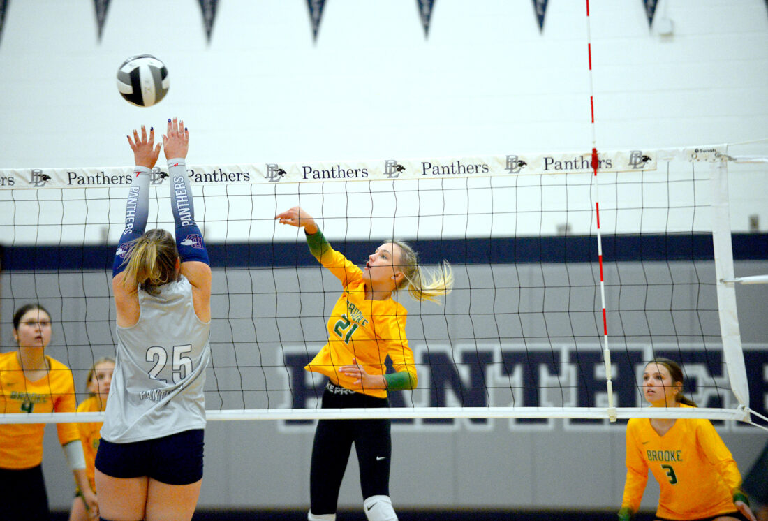 - Brooke’s Kadence Nielsen hits past the Panthers’ Sammi Westfall during Monday’s match. – Andrew Grimm